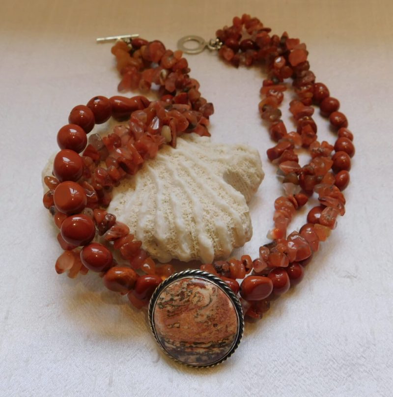 El jaspe es reconocido por simbolizar estabilidad, protección y conexión con la tierra. En este diseño, el dije de jaspe leopardo se convierte en el elemento central, aportando un patrón distintivo y tonos cálidos que evocan fuerza y autenticidad. El ágata, por su parte, equilibra la pieza con sus vetas suaves y su simbolismo de armonía y serenidad, creando una combinación visual elegante y natural. https://es.wikipedia.org/wiki/Jaspe